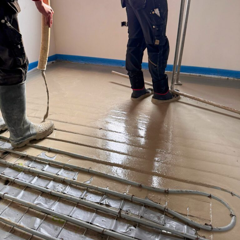 Ramp! Bij de vloeropbouw van dit nieuwbouwproject in Brugge was de pas niet goed gezet en was er op sommige plaatsten nog maar 2,5cm(!) over voor de chape met vloerverwarming.